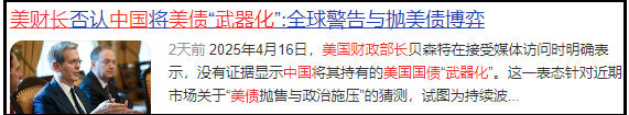4月14日前財長耶倫跑出來安撫市場説“中國不會拋售美債”;4月16日現任財長貝森特又跑出來喊“中國美把美債武器化”。