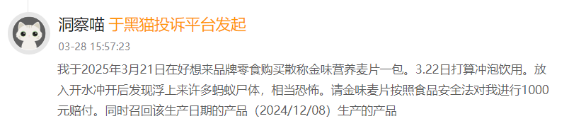 例如,在黑貓投訴平台,有消費者3月28日投訴表示,其於2025年3月21日在好想來品牌零食購買散稱金味營養麥片一包,3.22日打算沖泡飲用。放入開水衝開後發現浮上來許多螞蟻屍體,相當恐怖。