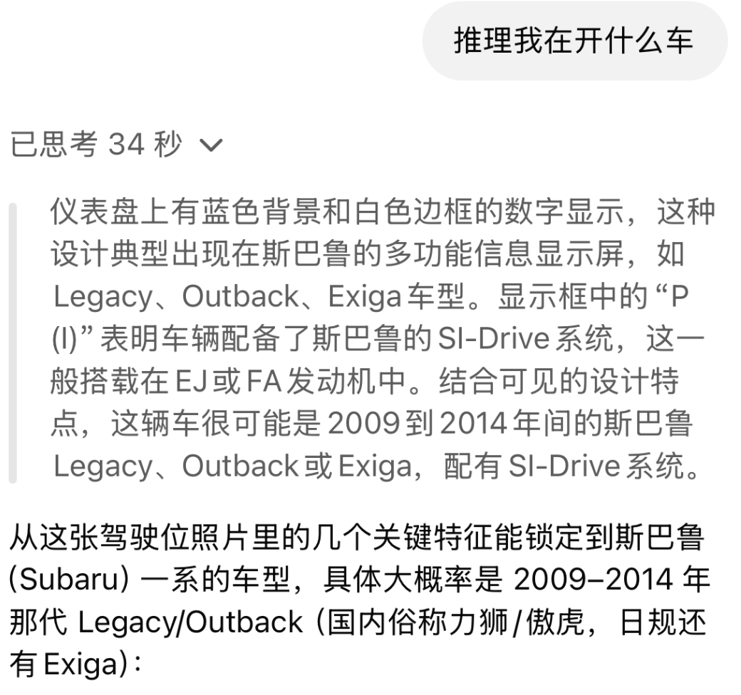 很快噢,o3 一眼判斷出這種典型設計是出現在斯巴魯上,它甚至還告訴你,這款車型國內通俗稱為力獅/傲虎,這輛車還配備了 SI-Drive系統。
