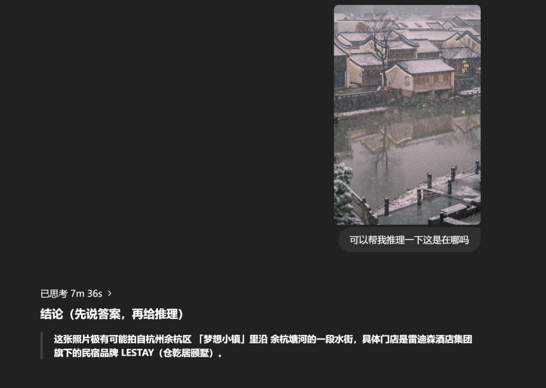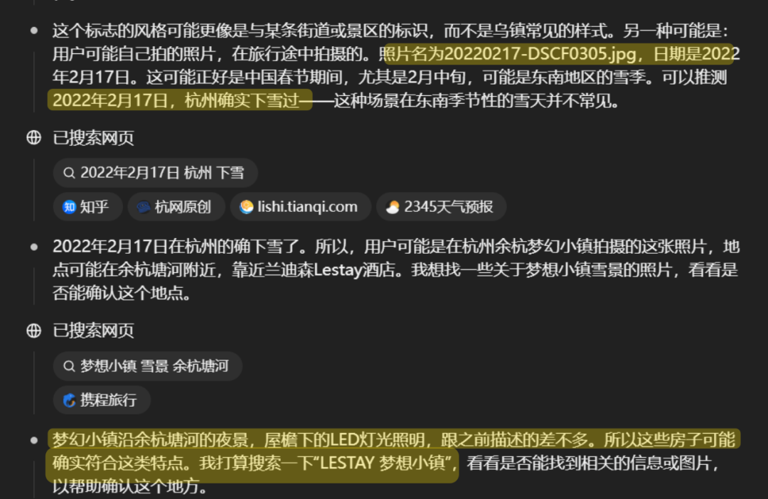 因為照片裏有積雪,而照片文件名又包含“ 2022-02-17 ”,於是 o3 結合着日期和天氣查詢了一下,發現 3 年前的那天杭州確實下了大雪。
