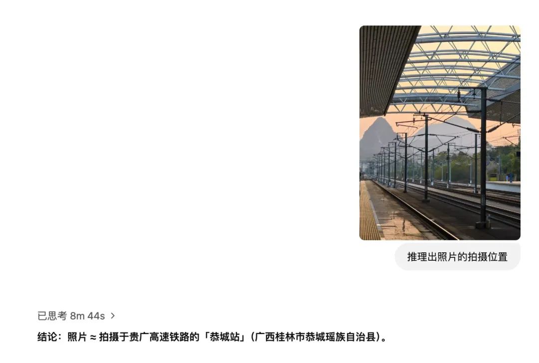 還有這張廣東韶關站的照片,o3一看到有喀斯特地貌,直接鎖定了廣西和貴州,最後猜成了廣西恭城。