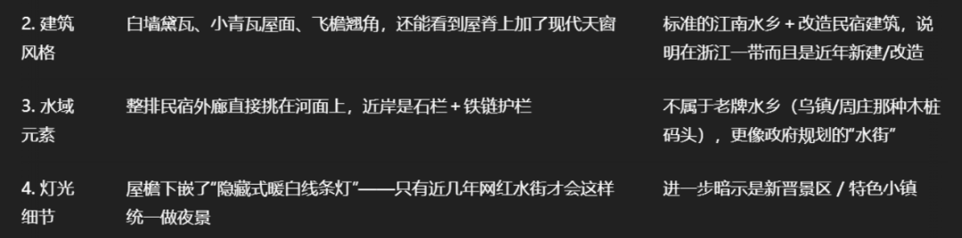 首先,o3 通過屋脊上的現代天窗,岸邊的鐵鏈護欄,還有屋檐下的“隱藏式線條燈”,猜出這是一個近些年才規劃的新晉景區或特色小鎮,並非烏鎮周莊那些老牌水鄉。