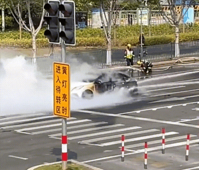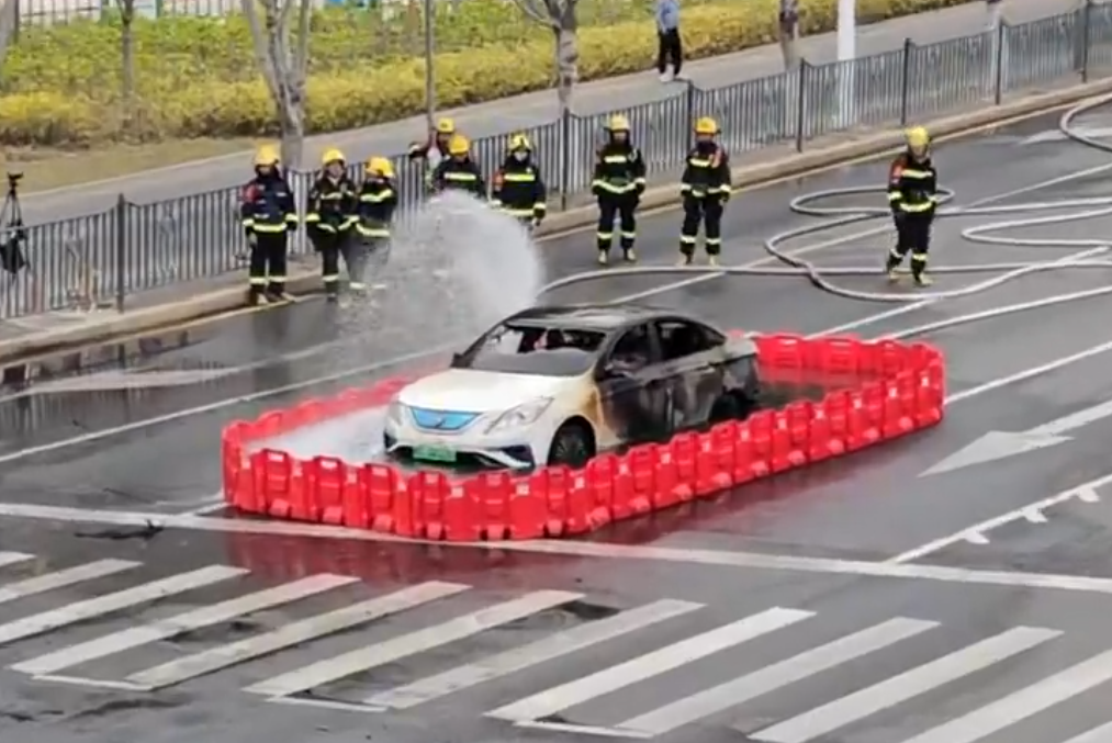 面對一輛起火的新能源車,幾個消防員先拿出兩三管高壓水槍對着一頓輸出,結果有煙無傷。。。除了火勢減小以外,車底的火苗仍舊不停爆燃。