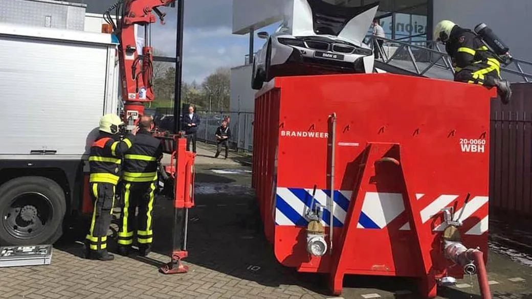 最早在 2019 年,荷蘭的寶馬 i8 起火事件就用過類似的思路。它是用一個吊車,直接把車給扔進 10 噸水的水箱,但這玩意兒成本太高,等找到合適的水箱和吊車,電池可能都燒完了。