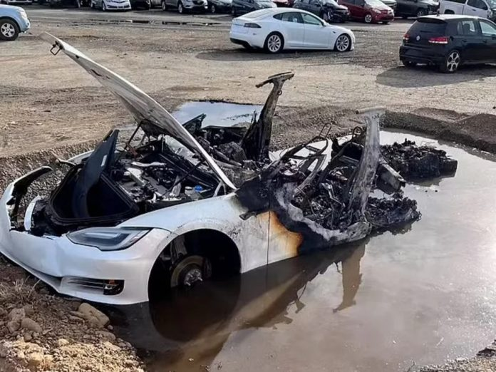所以後來在 2022 年,美國人就直接用拖拉機原地挖一個坑,往裏面不停灌水,再把車拖進水坑裏撲滅。