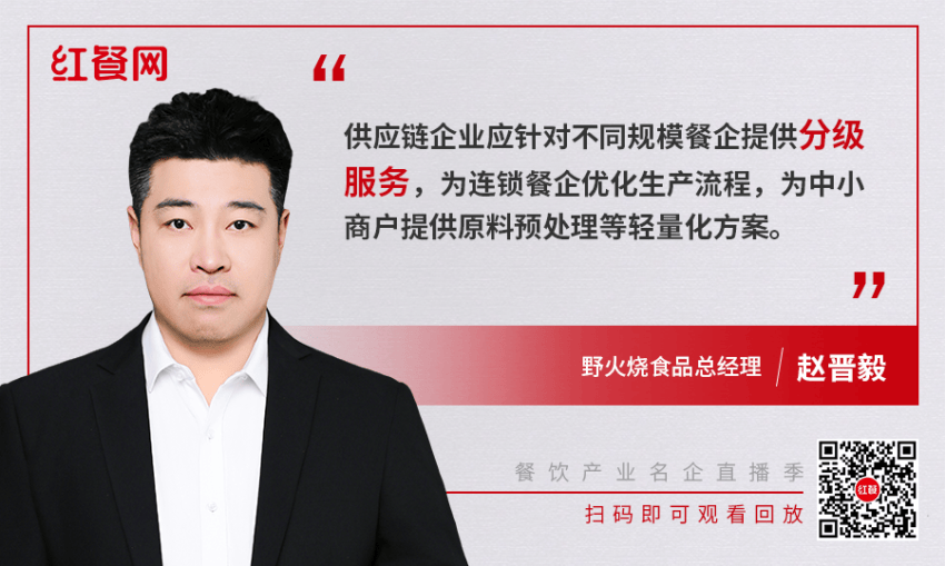 趙晉毅認為,現代供應鏈企業正升級為餐企的戰略合作伙伴。供應鏈企業一方面通過保留關鍵的手工工序還原"鍋氣”,突破工業化味道的侷限;另一方面基於原料行情預判,協助餐企規劃利潤產品組合。此外,野火燒通過"標準化、規模化、定製化"三化策略,實現降本增效的同時,讓餐企專注運營,共同構建盈利護城河。