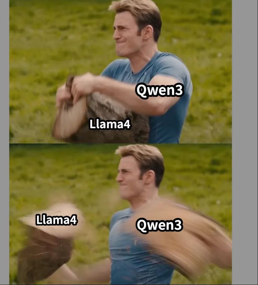 尤其在Llama4首秀翻車後,阿里的通義千問Qwen3也就受到了更多人的期待。有好事者甚至還做了個梗圖: