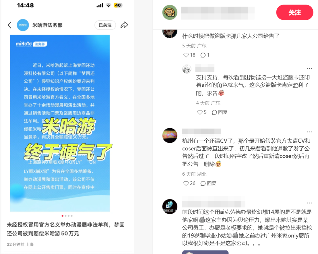 夢迴還公司冒用米哈遊官方名義,以“ONLY”為名在全國多地舉辦動漫展和演出活動,銷售盜版遊戲周邊,涉及米哈遊旗下74個遊戲角色形象。法院判決夢迴還公司賠償米哈遊經濟損失及維權合理開支50萬元。