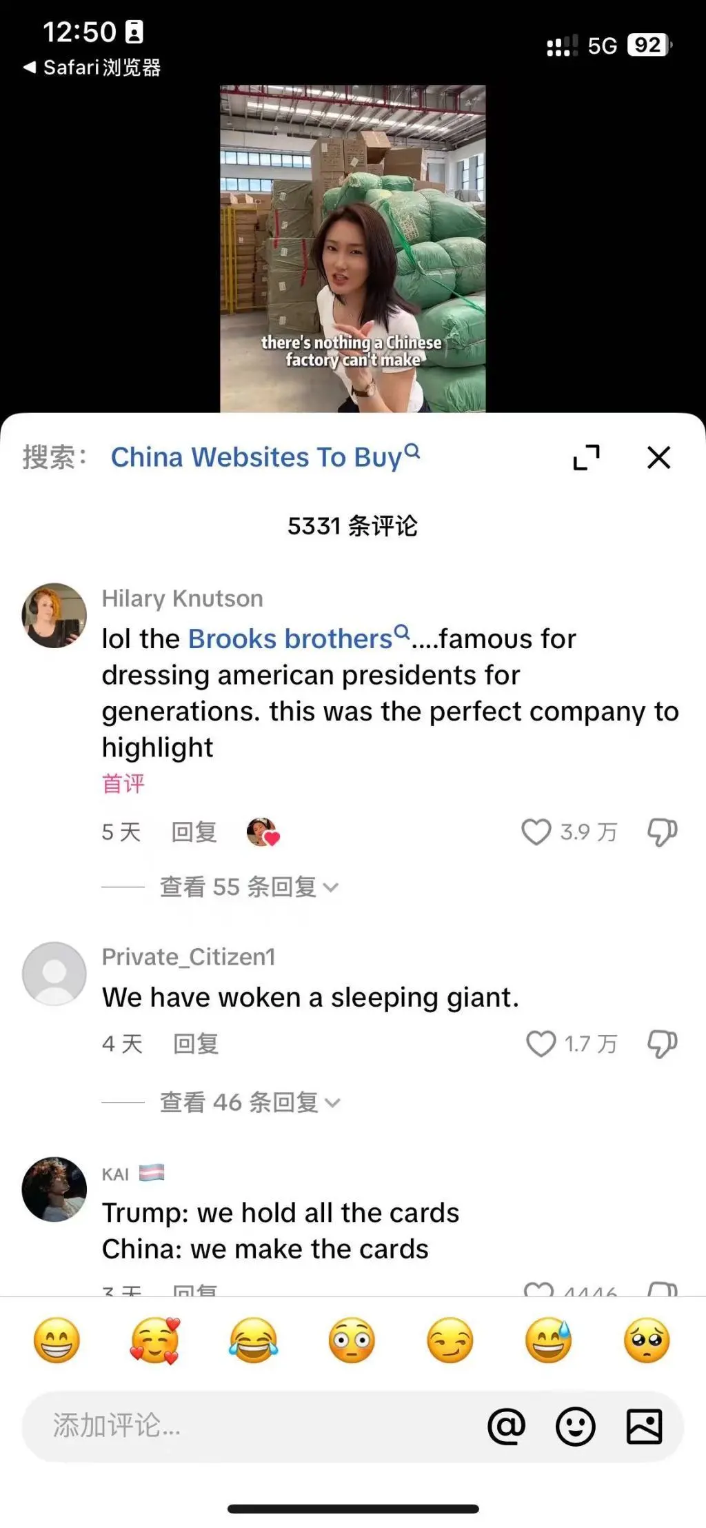 例如,TikTok博主@LunaSourcingChina發佈了一則三天內觀看量超過360萬次的視頻,在視頻中她來到一家中國工廠,稱該廠生產的Lululemon瑜伽褲出廠價僅為5美元至6美元,但其在美國的零售價超過100美元,“材料和工藝基本相同”。雖然這位博主沒有在視頻中直接上鍊接,但網友們已經開始在評論區分享起自己收藏的平台,並盛讚中國電商平台的高性價比。
