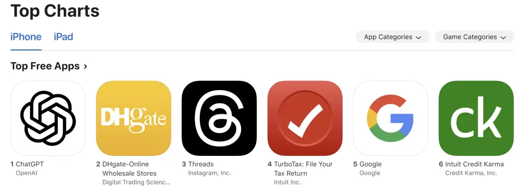 近日,美國特朗普政府多輪加税政策對跨境電商行業造成連續打擊。然而,成立至今已有21年的中國跨境電商應用敦煌網(DHgate)卻在美國市場異軍突起。4月15日,敦煌網一躍成為美區App Store免費應用榜上排名第二的iPhone應用程序,僅次於ChatGPT。此前,敦煌網在美區App Store免費榜上長期處於300名左右。