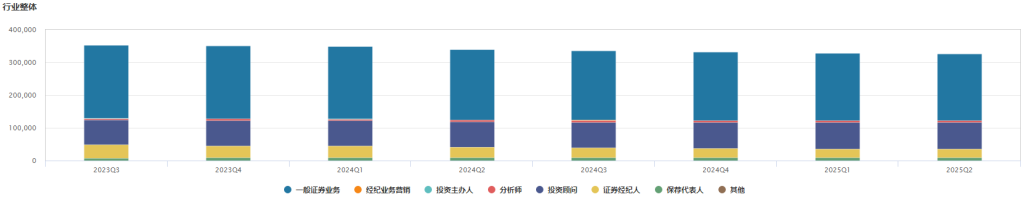 其中,一般證券業務、經紀業務營銷、投資主辦人、證券經紀人等細分領域的從業人員,近兩年均出現減少,分別從2023年三季度的22.22萬、358人、692人、4.00萬,降至了2025年二季度的20.39萬、285人、420人、2.71萬。