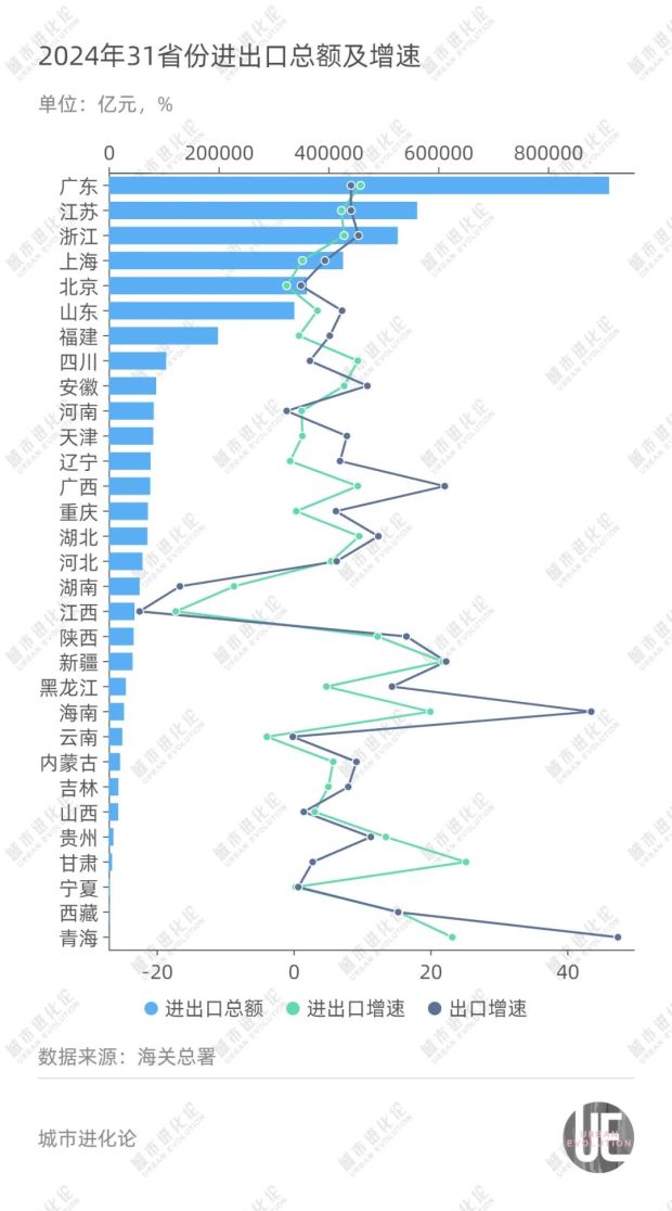 2001—2020年間,浙江進出口總額年均複合增長15.3%,居沿海省市第一。2024年,浙江進出口規模首次突破5萬億元大關,全國份額邁上12.0%的新台階,9.5%的出口增速,繼2023年後再居東部沿海主要省市首位。