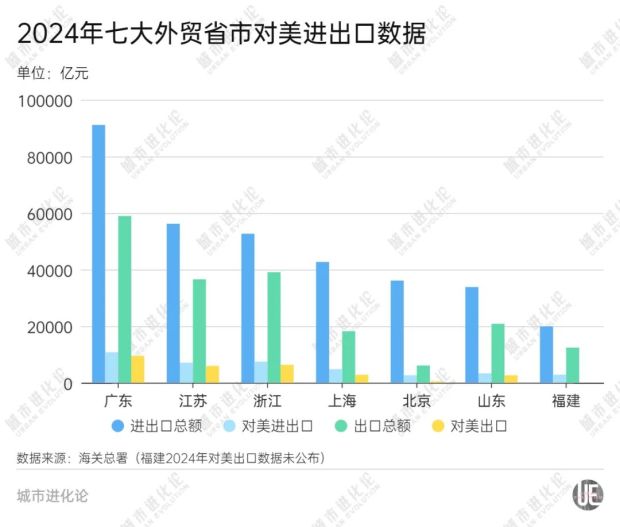 其中,“外貿第一省”廣東對美出口規模高居全國第一,2024年達到9488.1億元,佔全省出口總額的16.1%、GDP的6.7%,同樣明顯高於全國平均線。