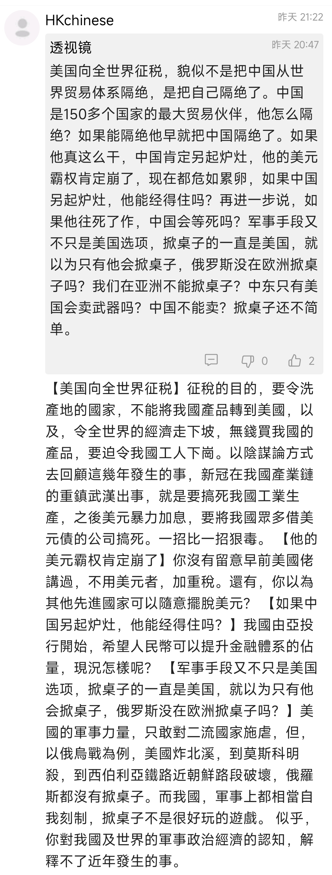 你説他用關税讓世界經濟下行,無錢買中國貨,中國貨物美價廉,無錢了是不是更要買這樣的貨?工人下崗失業,世界經濟衰退這是每個國家都要面對的問題,我們有產能,即使就業不好,以我們的體制還是可以解決好他們的衣食住行。美國沒有產能,如果大家一起硬挨經濟“核冬天”,是我們能捱過去還是他們能捱過去?