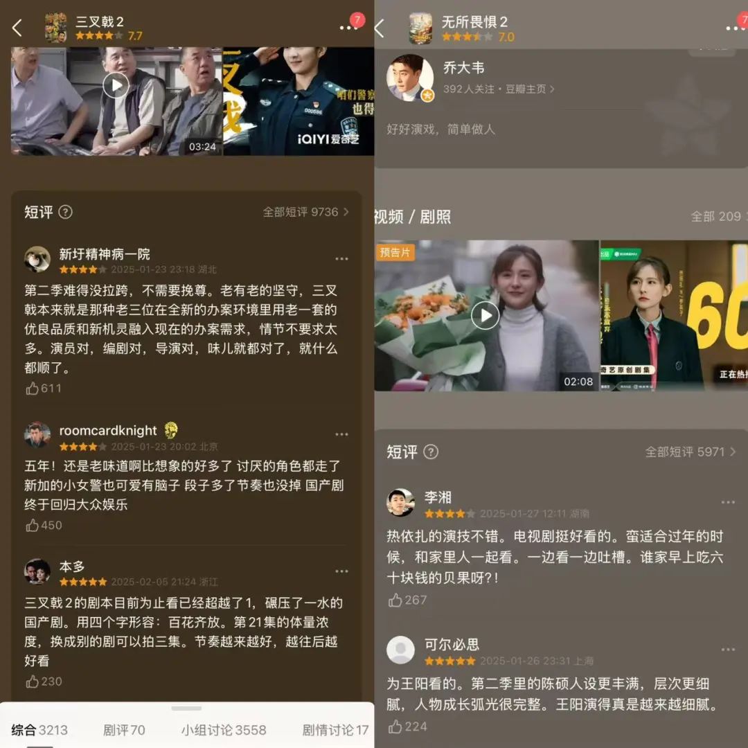 兩部系列IP劇集的表現穩定,《三叉戟2》保留愛奇藝的刑偵優勢,聚焦“老警察+新犯罪”敍事,將現實熱點融入劇情。《無所畏懼2》則聚焦女性職場困境,通過“職場PUA”“35歲危機”等議題引發網友共鳴。兩部劇集的評分分別為7.7和7.0,觀眾反饋也較正面。