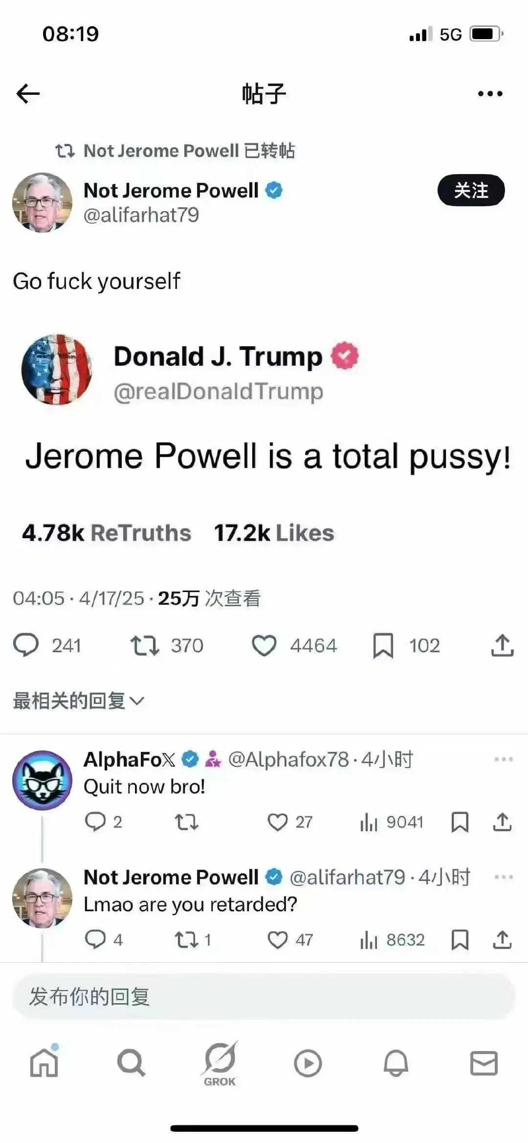最近幾天,洋相又來了。一個是川普和美聯儲主席鮑威爾爭吵,川普罵鮑威爾是弱智,鮑威爾立馬回罵川普,讓川普“滾你媽的”。