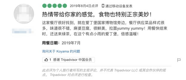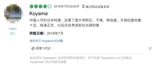 在愛丁堡一家名叫Koyama的日料店點評頁下,許多網友留下了點評“中國人開的日本料理店,很正宗。”“麻婆豆腐,很鮮美,拉麪,yummy yummy。”“不用透支信用卡就能吃日料的好地方。”