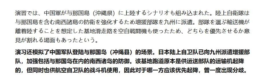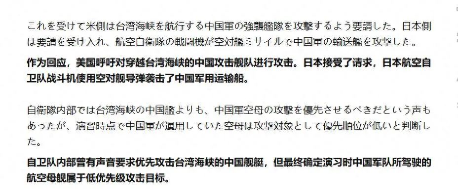 “在此次演習中,美方要求日本對橫渡台灣海峽的解放軍強襲艦隊發動襲擊,日方接受了這一要求,航空自衞隊的戰機隨即使用空對艦導彈攻擊瞭解放軍的運輸艦。此前,自衞隊內部曾有聲音認為,應當集中火力打擊解放軍航母等重點目標,但在演習過程中,中國航母被判定為攻擊目標的優先級較低,自衞隊的主要假想作戰對象仍然是解放軍的登陸部隊。”