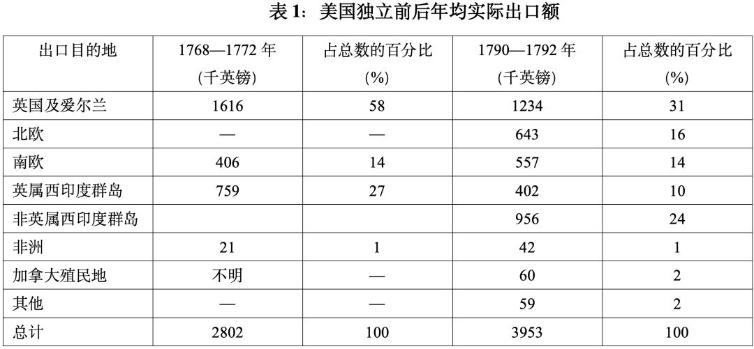 漢密爾頓主張加強對英貿易,除了他個人一向親英外,在當時只是反映了一種貿易結構的現實。美國原本處於大英帝國構建的經濟體系中,獨立反而使美國被排除於英帝國經濟圈外。例如,在加勒比海,美國船隻不允許與英屬西印度羣島直接貿易,試圖逃避英國法律的美國商人可能會被官員扣留。受限於英國《航海法令》,美國造船業喪失了其主要市場。1783年以後,由於美國鯨油麪臨過高的英國關税,美國的船舶生產進一步下降。美國與法國的經濟升温,也無法彌補其與英國貿易冷淡所受的損失。表1顯示了獨立前後美國出口貿易地理方向的變化,從中可見英國的佔比雖有下降,但仍然居於首位,且絕對值亦較大。這種經濟現實使得在政治品味之外,漢密爾頓親英又多了一層理由。