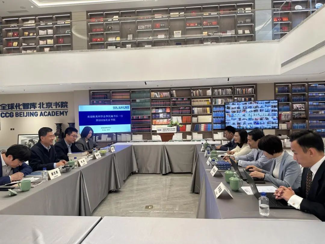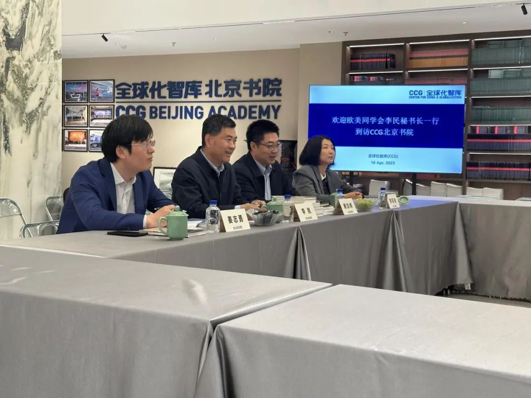 2025年4月16日下午,歐美同學會黨組書記、秘書長李民,黨組成員、副秘書長滕劍峯,諮詢中心負責人姜志勇,諮詢中心幹部李羽佳一行蒞臨全球化智庫(CCG)北京書院,與CCG創始人兼理事長王輝耀,聯合創始人兼秘書長苗綠,副主任鄭金連,對外合作部總監趙佔傑以及助理研究員許澤陽展開會晤交流。雙方就各自機構的主要業務發展情況進行了詳細介紹,並回顧了過去二十年雙方攜手共進的合作歷程。