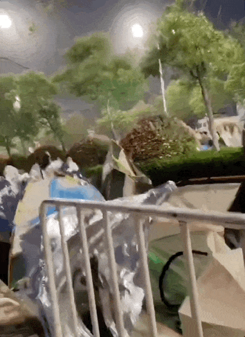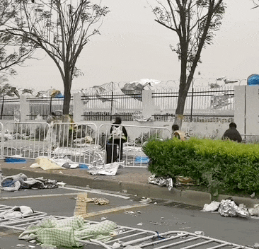 實在是夜裏降温凍得受不了了,只能在帳篷外裹滿了保温膜;但妖風一吹,直接連棚頂都掀翻了。