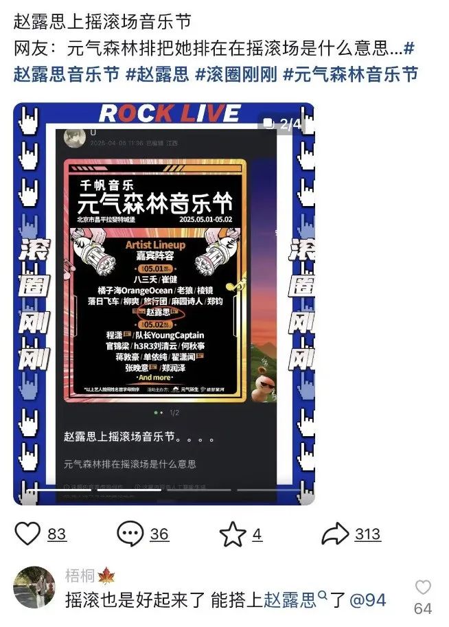 再比如這位以“奶屁音”著稱的女頂流,也要上搖滾音樂節了。