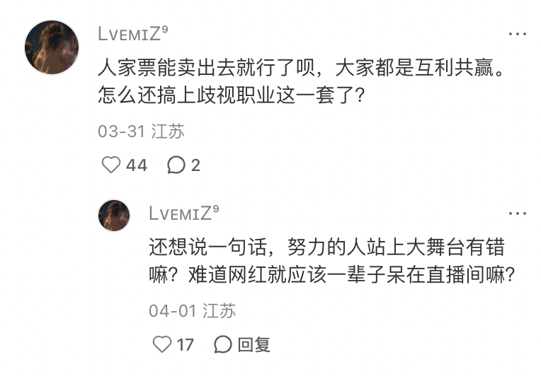 她們還會説:“人家票能賣出去就行了唄,努力的人站上大舞台有錯嗎?難道網紅就應該一輩子呆在直播間嗎”?