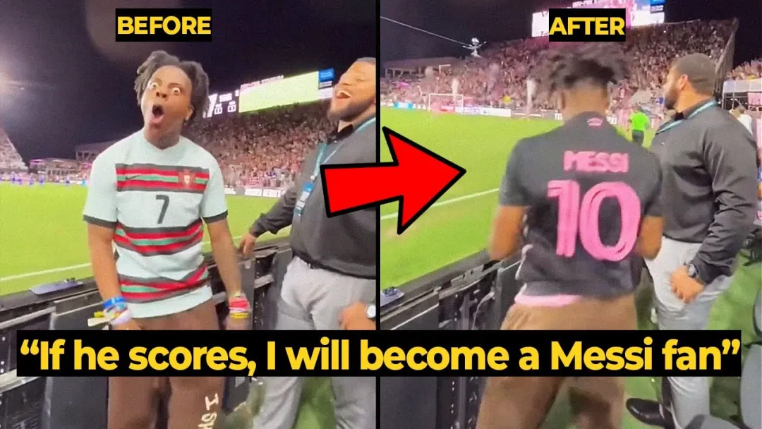 後來這個套路又用到了美職聯,還成了升級版。現場觀看邁阿密比賽時,他在梅西主罰任意球前大喊“如果這球能進,我就當梅西粉絲”,結果這球真進了,他立刻脱掉C羅球衣,裏面還真準備了梅西球衣。