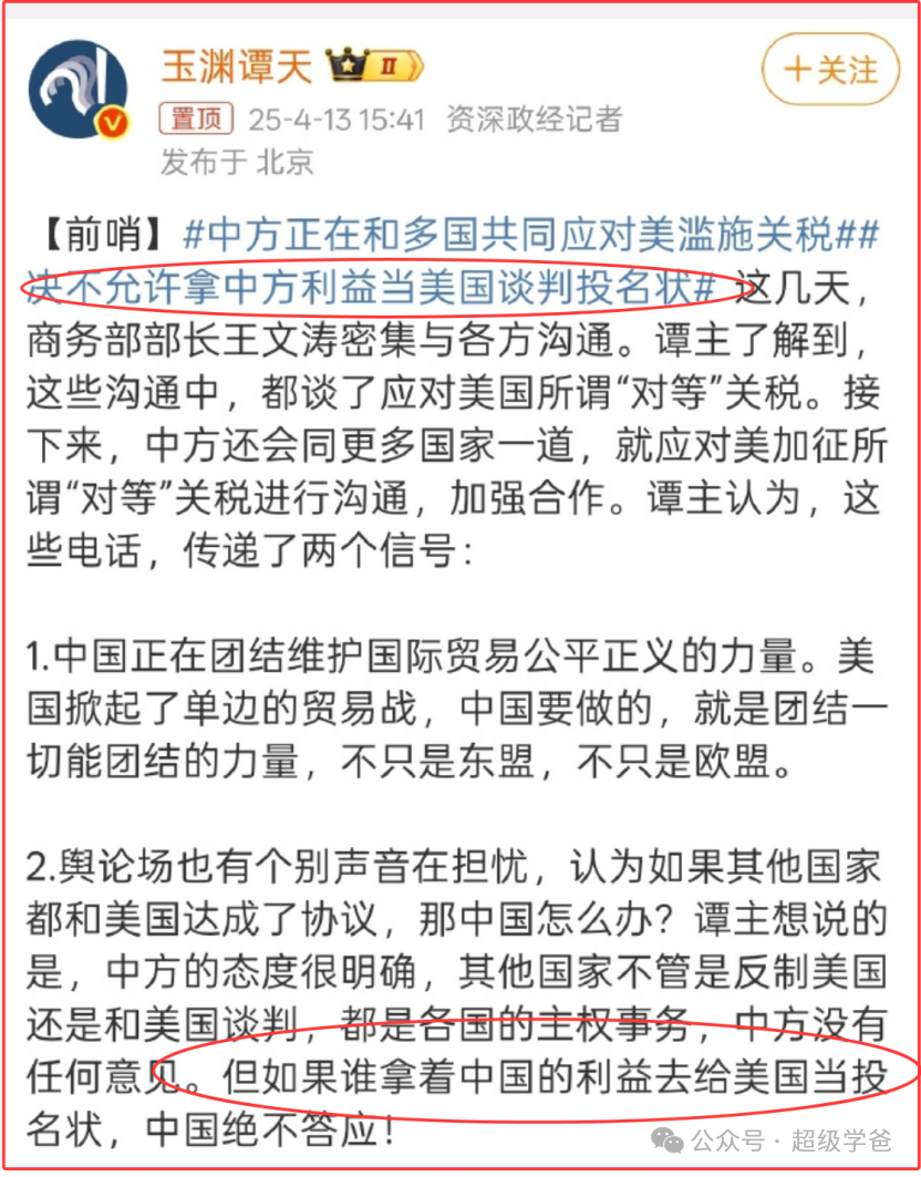 我們一旦跟美國達成協議,他轉頭就去收拾其他國家去了,其他國家根本扛不住。我們現在就是全球化和自由貿易的頂樑柱,也是貿易反霸事業的主力軍。