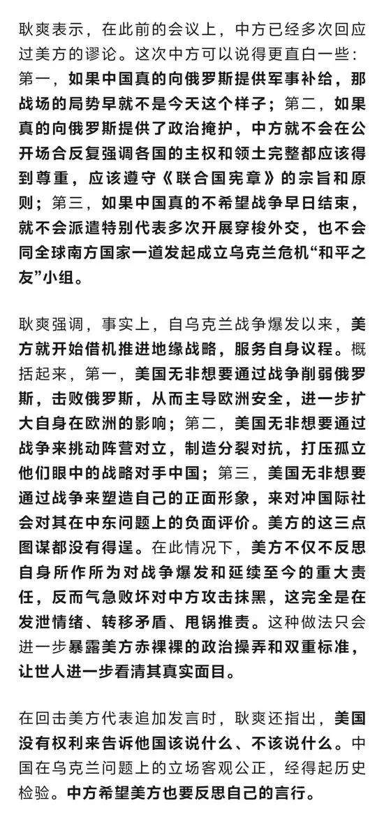 耿爽揭露了美方的三點圖謀,要求美方代表停止虛假敍事。面對澤連斯基的無端指責,中方外交部發言人林劍表示,“中國在烏克蘭問題上的立場一貫明確,一直積極致力於止戰停火,勸和促談。”