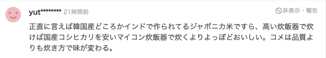 “説實話,不單是韓國米,就算是在印度生產的日本米,也沒有日本米好吃。此外,電飯煲的品質以及烹飪方式也會影響到大米的口感,同樣是國產的越光米,用昂貴的電飯煲煮出來,會比用便宜的電飯煲煮出來的好吃。”