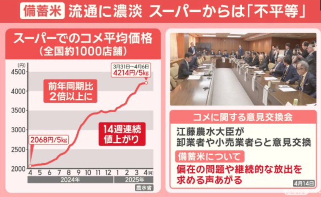 日本政府一直試圖通過投放儲備大米、宣佈各種利好消息安撫民眾憤怒的情緒,比如日本農林水產省於4月18日宣佈,2024年生產的大米在2025年3月的相對交易價格為2萬5876日元(所有品牌每60公斤糙米的平均價格),為時隔8個月首次下跌。
