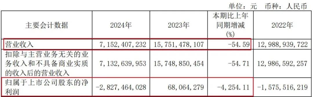 2024年,公司實現營業收入71.52億元,同比下跌54.59%;歸母淨利潤虧損28.27億元,直接由盈轉虧。