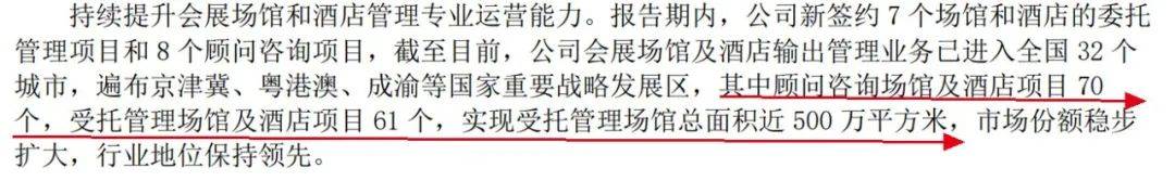 對於這些會展場館,公司主要通過自持及輕資產管理輸出等方式進行管理。其中,自持場館包括國家會議中心一期、北京國際會議中心、長沙北辰國際會議中心等;輕資產管理中,顧問諮詢場館及酒店項目70個,受託管理場館及酒店項目61個。