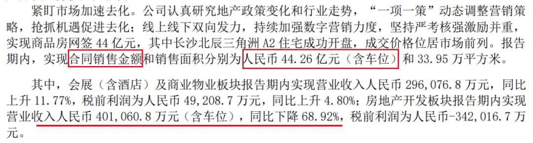 在房地產開發板塊,2024年,公司實現合同銷售金額44.26億元(含車位),同比下滑16%;營業收入40.11億元(含車位),同比下降68.92%。