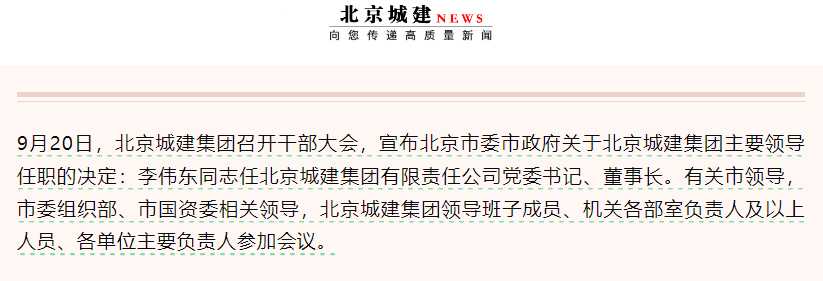 在北辰實業工作8年之後,李偉東被調往北京城建集團。北京城建集團官微披露,2024年9月20日,北京城建集團召開幹部大會,宣佈北京市委市政府關於北京城建集團主要領導任職的決定,李偉東任北京城建集團黨委書記、董事長。