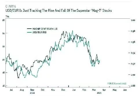 4. 例如,人民幣對美元貶值,是用美元換人民幣投資中國的減少。新外資在中國賺錢難,新開廠賺不到、炒股還套。以前外資在中國好賺,就換匯進來,人民幣升值。在印度有段時間好賺,外資大增,最近也不好賺了。歐元換美元,主要是去炒美股七巨頭,歐元匯率和七巨指數高度同步。