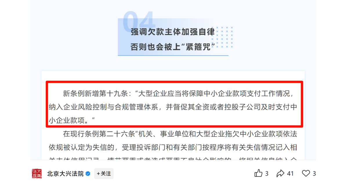 零售行業的演變是其一,政策的關注是其二。3月17日,國務院發佈修訂後的《保障中小企業款項支付條例》,新條例將於2025年6月1日起實施。其中新增的第十九條明確指出:“大型企業應當將保障中小企業款項支付工作情況,納入企業風險控制與合規管理體系,並督促其全資或者控股子公司及時支付中小企業款項。”