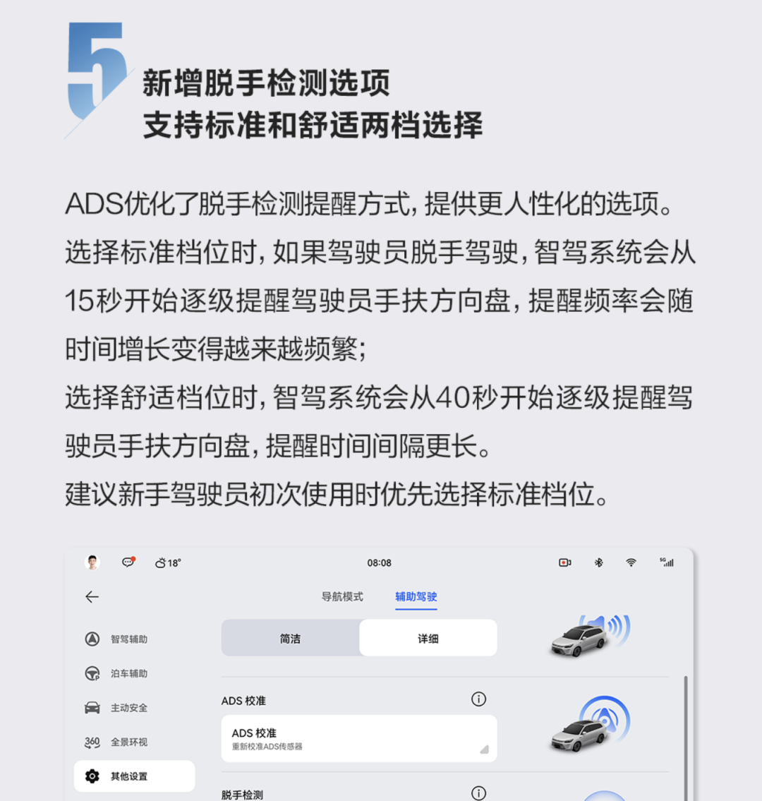 在去年3月一次OTA升級中,問界新增了脱手檢測選項。用户若選擇舒適檔位,智駕系統在脱手40秒後,才開始逐級提醒。
