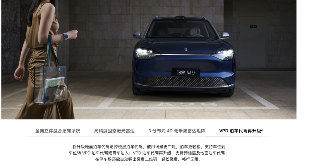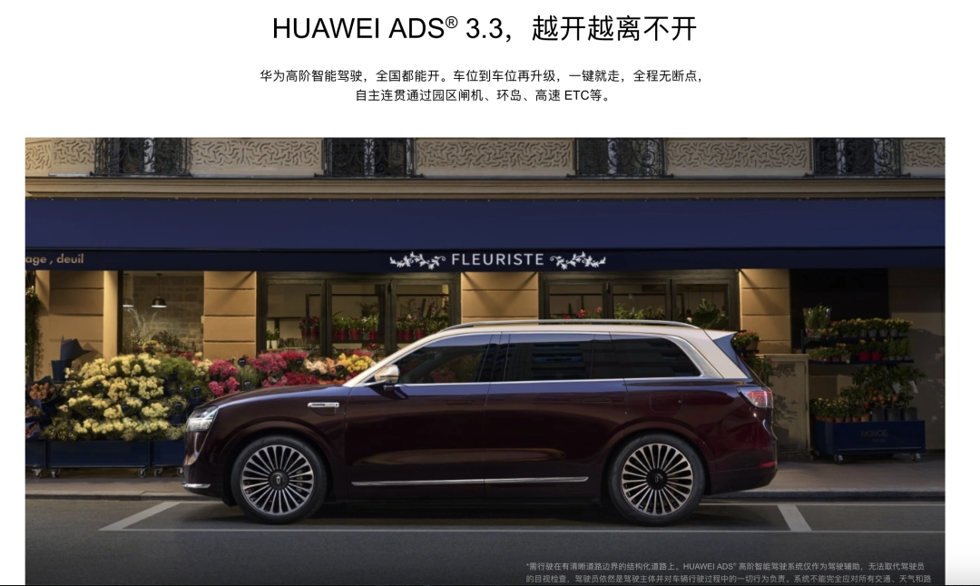 比如問界官網上,問界M9的宣傳就明確寫着,“華為高階智能駕駛,全國都能開,越開越離不開”。