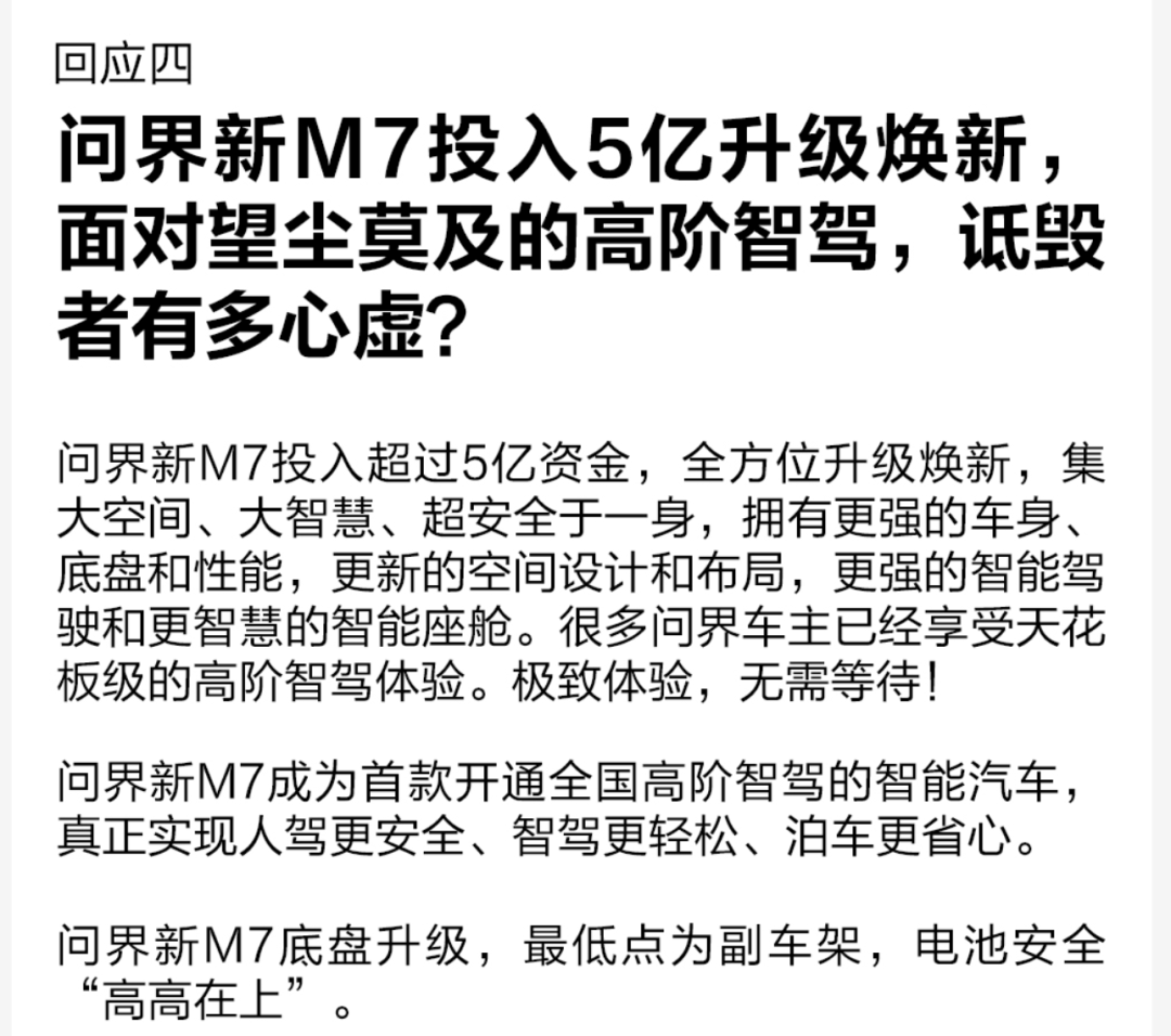 拿問界來説,問界新M7號稱首款開通全國高階智駕的智能汽車,問界一直宣稱自己的高階智駕“遙遙領先”,甚至不惜因此與友商、觀眾對線。