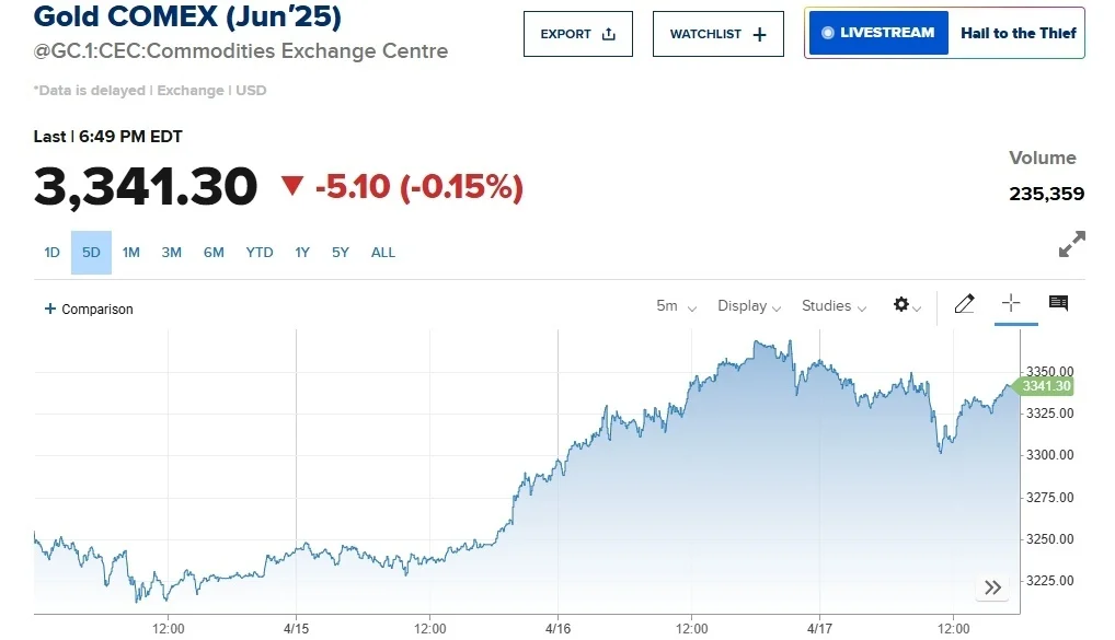 △近期受美關税政策影響,市場恐慌情緒蔓延,投資者投資策略偏向避險,進而拉昇國際金價的走高。美東時間4月18日,美國紐約商品交易所6月黃金期貨價格收於每盎司3341.30美元,較前一日小幅下跌,但仍處於高位。