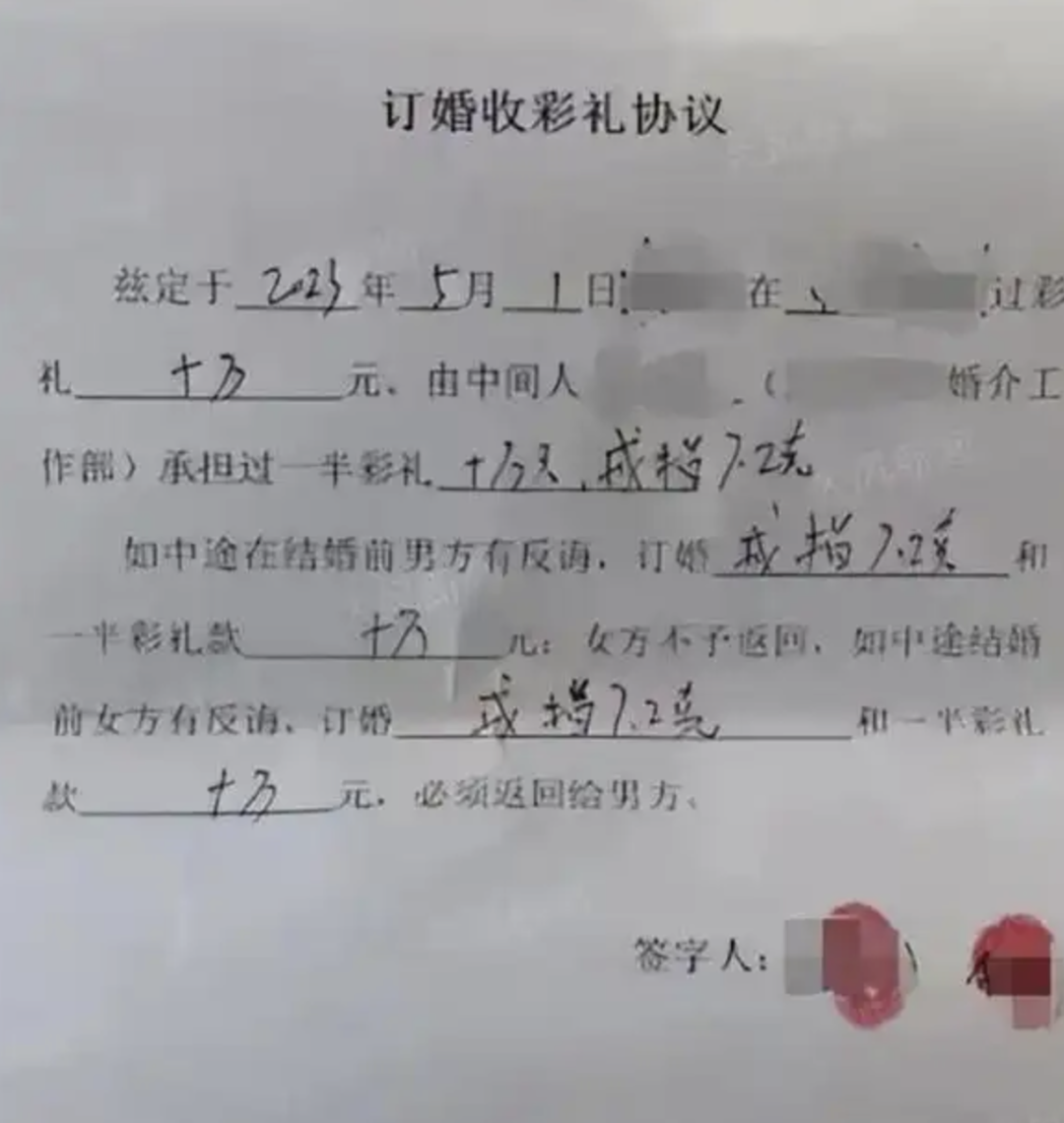 我看媒體報道他們倆家人甚至簽了一個協議,上面寫着多少多少彩禮,然後鑽戒什麼的,還有婚房要加名字,不過是結婚一年之後加名字,寫完之後雙方還簽名摁手印。