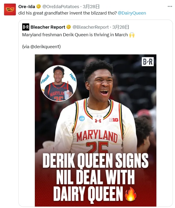 在社交媒體上,他們也不忘了玩梗整活兒,比如,當DQ冰淇淋簽下了名字縮寫是DQ的選秀熱門球員德里克-奎恩(Derik Queen)時,Ore-Ida帶着優越感轉發調侃道:“難道他的曾祖父發明了暴風雪冰淇淋嗎?”