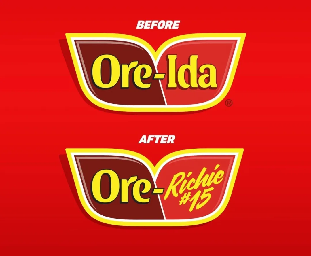 為了抓住這個風口,Ore-Ida很快啊,啪地一下就過來和裏奇-桑德斯接洽,拍宣傳照什麼的,都是基本操作,最騷的是,Ore-Ida違背了祖宗的決定,決定在甜蜜16強賽前臨時更名為“Ore-Richie”,後半部分變成了裏奇-桑德斯(Richie Saunders)的名字。