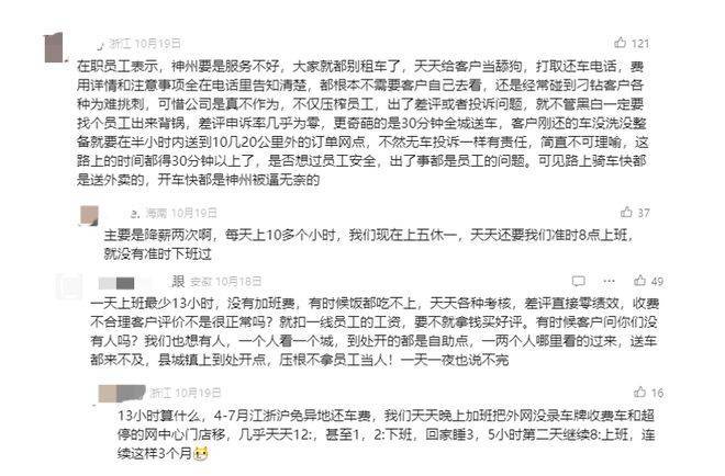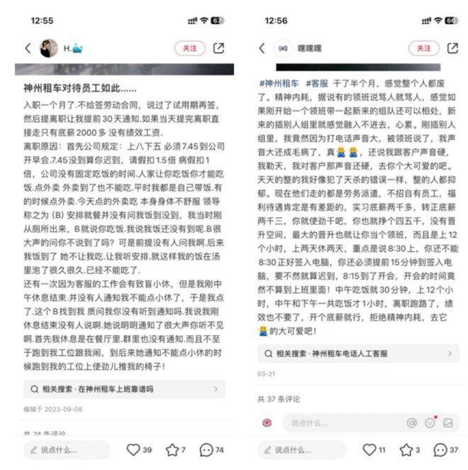 內部管理問題,是神州租車陷入困境的重要原因之一。員工待遇差、加班無補償等問題,早已在員工中積怨已久。據社交媒體平台上的員工反饋,神州租車的工資水平低,工作時長卻很高,員工常常需要在高壓環境下工作。這種高壓工作環境不僅影響了員工的工作積極性,也直接導致了服務質量的下降。員工的不滿情緒積壓已久,服務質量的下降和客户投訴的增加也就不足為奇了。神州租車的內部管理混亂,缺乏人性化管理,使得員工流失率居高不下,進一步加劇了企業的運營困境。