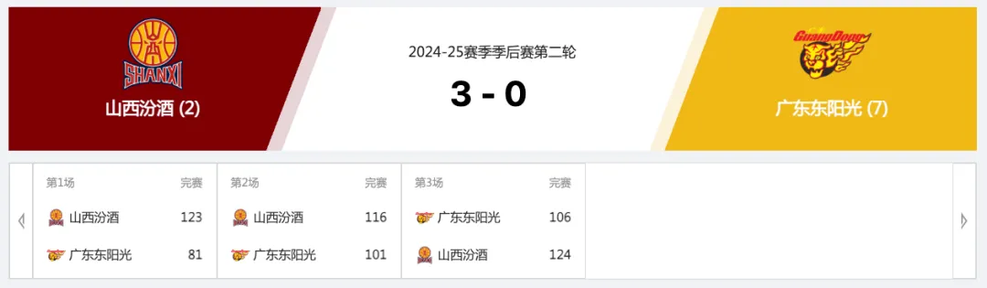 0-3!這是廣東東陽光和山西汾酒系列賽對壘的最終結果。42、15、18,這是系列賽每場的分差,廣東男籃三場比賽總共輸了75分。