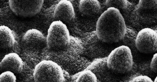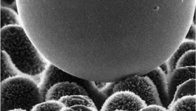 最典型的關於表面的例子就是荷葉。在盛夏的荷花池中,總可以看到荷葉上承載着晶瑩的露珠,只要稍微施加力度,露珠就可以順着荷葉滑落,那為什麼荷葉不會被水沾濕?其實就是“荷葉效應”在起作用。1997年W.Barthlott和C.Neinhuis發表了“荷葉效應”的原始文章,通過研究荷葉表面的微觀結構,發現荷葉表面並不光滑,而是由一個個小乳突的粗糙表面。這種表面使得水珠在荷葉表面上自由滾動而不沾濕荷葉。