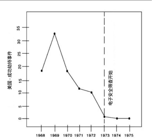 於是從1973年開始,所有從美國機場登機的旅客都要接受金屬安全檢查。同時成立了聯邦空中警察部門,派警察進入客機中,航空公司也會聘請保安承擔“空警”。此後,美國劫機事件大幅減少。