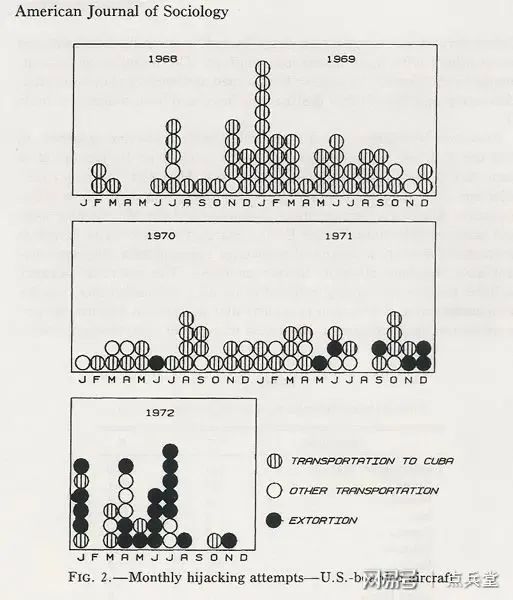 ▲美國在六七十年代的被劫機頻率,每個月都有好幾起,而且大部分目的地都是去古巴(大部分劫機去古巴的,目的只是為了去共產國家看看,旅遊一下,然後被遣返逮捕)